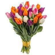 Букет состоит из палитры разноцветных тюльпанов. В этой композиции гармонично дополняют друг друга нежные розовые, невинные белые, яркие оранжевые и великолепные сиреневые цветы. Каждый из них имеет собственное значение, но все вместе они символизируют целую гамму эмоций, которые испытывает человек к получателю подарка. С помощью такого букета вы можете выразить неподдельное искреннее чувство симпатии и подарить любимому человеку положительные эмоции и невероятное эстетическое удовольствие.